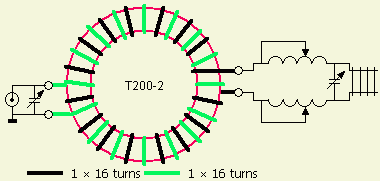 Als balun aan de ingang gebruikt hij een mantelstroom filter (choke balun). Om effectief te zijn op 160 m, moet de zelfinductie daarvan minstens 5 × 50 Ω = 250 Ω = 22 µH zijn.