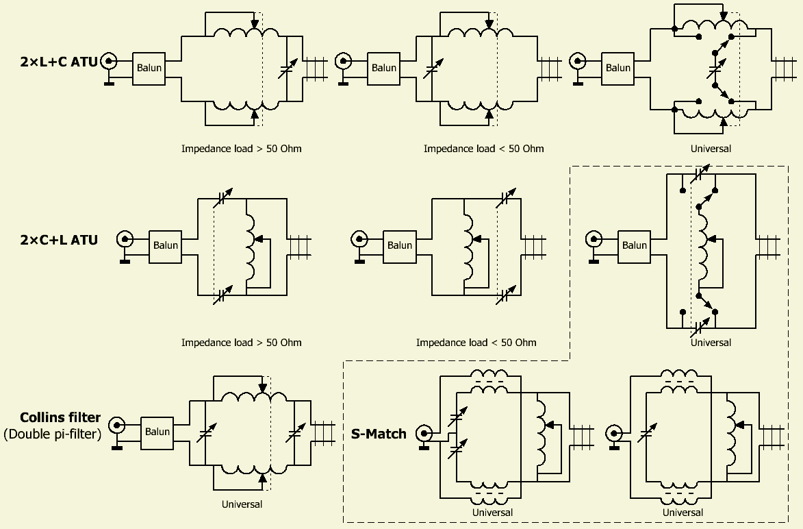 (1) Bij het aanpassen van een lage impedantie is een grote capaciteit nodig en moet vaak de condensator aan de kant van de balun geschakeld worden. (In het laatste geval is er sprake van een lagere impedantie dan 50 Ω en dan kan een klein type meervoudige variabele condensator ingezet worden).
