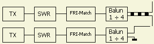 I use a FRI-match almost exclusively as an asymmetrical tuner for coaxial feed antennas or as a tuning unit between transmitter and a HF amplifier to be tested. If a symmetrical antenna system needs to be adjusted, I use (fig ») it in combination with a suitable balun at the output of the ATU. See for example coax balun.