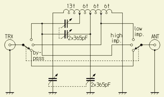 More is possible with this design, a combination of an asymmetrical and symmetrical tuner. The variable capacitors must be isolated mounted. A coaxial cable with antenna or a symmetrical line with antenna can be adapted at will. An isolation transformer (4 : 1) ensures that the 50 Ohm cable impedance is converted to a lower value so that the ATU can more easily adapt the higher impedances of antenna systems. Every tuner system has its limitations, but until now it was possible to tune my own W3DZZ with open-line power on all bands from 10 to 80 m.
