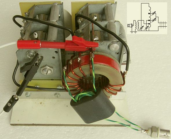 On the left a well-functioning version with a ! : 1 transformer with a pig nose. With my current inverted V of 2 × 16.50 m it was not necessary to switch in and output terminals.