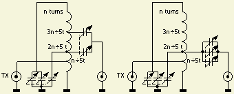 After experimentation with various antennas and complex loads, one 5 - 8 µH coil turns out to be the best tuning system for 10 to 80 m. The efficiency of the tuner is good, because it can be considered as an auto transformer with inductive and capacitive taps on the coil. Originally the design was a three knobs tuner (the left model). The results of further experiments were the middle and right model (with two knobs). The twin varicap has almost the same effect as the switched capacitor at the input of the left model. So a switch could be saved.