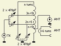 In practical use this tuner adjusts more than originally intended. It is just a matter of playing with both capacitors or connections. You have to find out and experience for yourself. An example of how it is possible is the adaptation of a wire antenna as shown opposite. The tap with the best adjustment must be determined experimentally. If you always use the same antenna, it only needs to be done once. It is also possible that an adjustment is successful by connecting the antenna directly to one of the taps.