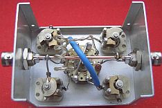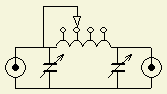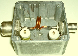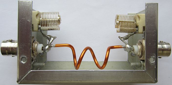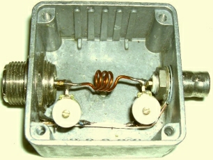 De schakeling kan ook dienen om een 50 Ohm coaxkabel aan te passen op 75 Ohm of omgekeerd. Het laatste type kabel heeft minder verliezen en dat wordt vaak vergeten. Als voorbeeld hoe dat te maken is, worden er twee spoeltjes getoond. Het kleine model is van 1 mm draad, heeft 4 windingen en is op een 5 mm boortje gewikkeld. Het grotere model is van 2 mm draad, heeft 2 windingen en is op een 10 mm boor gewikkeld. Voor een groter vermogen kunt u beter twee («fig) variabele luchtcondensatoren monteren. Bij de spoel in de rechter foto moest bij een overgang naar 75 Ohm de spatie iets vergroot worden. |