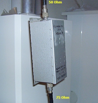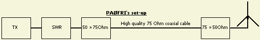 Hier ziet u (fig») mijn huidige systeem met 50 en 75 Ohm coaxkabel. Tussen de antenne en de 75 Ohm kabel zit een 52÷75 Ohm/70-160 MHz pass-band en tevens 200-400 MHz stop-band filter uit de dump. Dat werd veranderd in een 50÷75 Ohm/145 MHz filter. Het een en ander is uitgevoerd met hoogwaardige 75 Ohm kabel omdat de afstand van de shack tot de antenne nogal groot is.