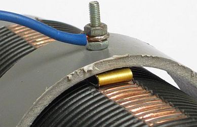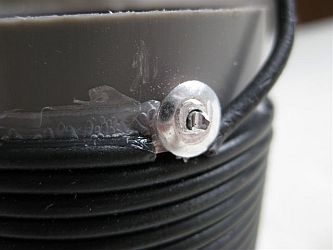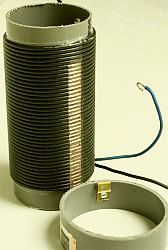De spoel is met 1.5 mm² zwart installatiedraad gewikkeld op een 6 cm PVC buis en het sleepcontact is gemonteerd op een ring van 7.5 cm PVC buis. De ring mag niet te breed zijn anders schuift dat niet soepel over de windingen. Breng over de lengte van de spoel een markering aan, met bij voorbeeld een Stanley mes, om bij het verwijderen van de isolatie steeds dezelfde breedte te behouden.