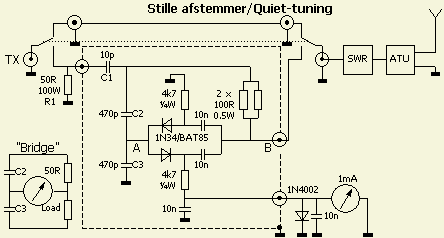 Dit ontwerp zorgt ervoor dat men u vrijwel niet hoort als een antennesysteem met een antennetuner (ATU) aan een 100 W zender wordt aangepast. Het vermogen wordt naar een geschikte dummy load geleid en een klein gedeelte ter grootte van een tiental mW zijn genoeg om een SWR brugschakeling te sturen.