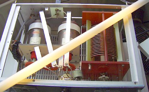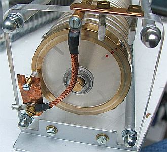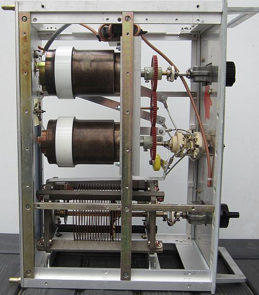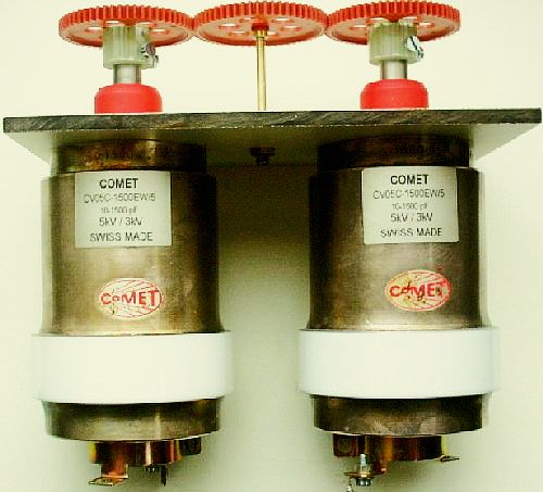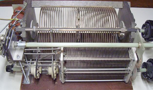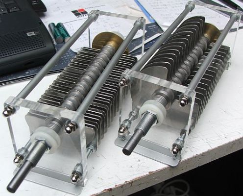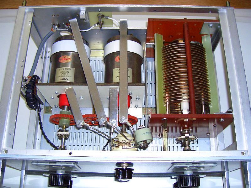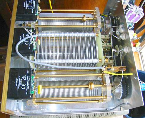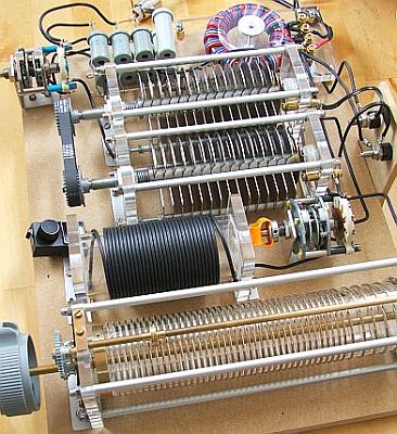 De twee 400 pF/1500 V variabele condensatoren zijn gekoppeld met kunststof tandwielen die gesloopt werden uit stappen schakelaars van oude telefooncentrales.