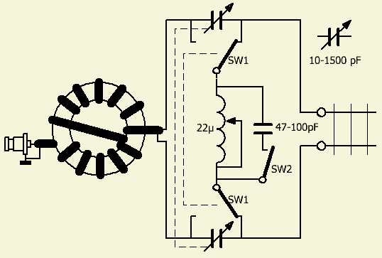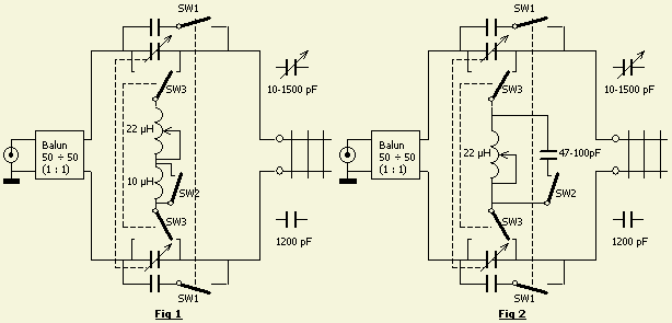 Om een diepe kast te vermijden, gebruik ik een korte rolspoel met voor sommige antennes net te weinig zelfinductie. Met een schakelaar kan een extra spoel in serie (fig.1) of een extra condensator (fig.2) parallel aan de rolspoel geschakeld worden. De laatste methode vermindert het rendement maar neemt weinig plaats in. Laat alles weg als uw rolspoel voldoende bereik heeft voor uw antennesysteem. Voor de zekerheid kan de capaciteit van beide vacuüm condensatoren vergroot worden met (SW1) een tweede schakelaar.