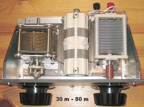 Belangrijk is een kleine minimum capaciteit van de variabele condensatoren vandaar dat in dit ontwerp 400 pF typen werden geplaatst. Een grotere capaciteit heeft ook een grotere minimum waarde als de platen geheel uitgedraaid zijn. Dat kan net teveel zijn om goed op de 10 en 12 m banden af te stemmen. De keuze wordt dus een compromis en men ontkomt meestal niet aan het inschakelen van vaste condensatoren parallel.