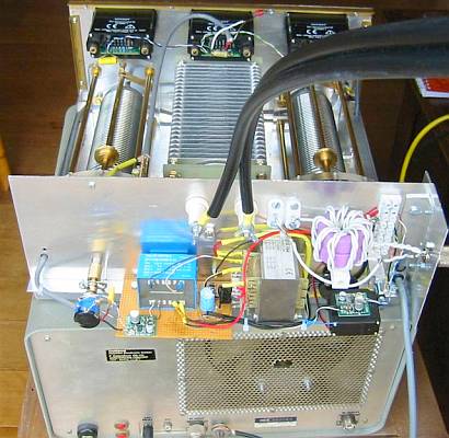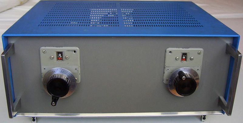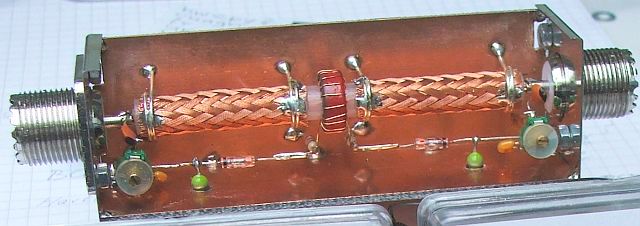 Mijn praktische uitvoering is gebouwd in een beschikbare maar eigenlijk te kleine kast. Er was op de frontplaat geen plaats voor het omschakelen van de variabele condensatoren. Daarom zit een schakelaar voor omhoog of omlaag transformeren aan de achterkant, op de foto linksonder. In de praktijk is deze schakelaar niet zo vaak nodig want meestal is de aan te passen impedantie groter dan 50 Ω.