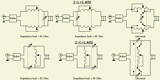 In het linkse schema transformeert de tuner 50 Ω naar een hogere impedantie en in het middelste schema kan men een antennesysteem aanpassen dat een lagere impedantie heeft dan 50 Ω. Twee aparte ATU's zijn onhandig en met een dubbelpolige schakelaar volgens het rechtse schema worden beide systemen in één apparaat verenigd.