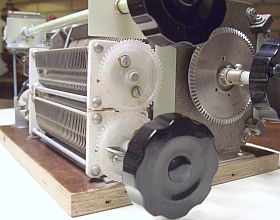 Maar een advertentie op eBay bracht mij op een ander idee. Er werd een pakket kunststof tandwielen met verschillende diameter aangeschaft. Dat was goedkoop en de moeite waard om een eventuele mislukking te riskeren. Met drie even grote tandwielen (fig») werd een goed resultaat behaald door met een draaibankje een askoppeling te draaien van een met glasvezel versterkte epoxy staaf. Dat werd vervolgens met sterke 2-componenten-lijm aan een tandwiel bevestigd. Ook werd in een later stadium op een tandwiel een verlengas gelijmd om een knop met een tellersysteem aan te drijven. Door passen, meten en schuiven van de componenten was gelukkig één van mijn vele 2dehands apparaatkasten geschikt om alles te herbergen. Zo'n kast moest wel stevig zijn want alleen al met de zware rolspoel en vacuüm c's woog het al 10.5 kg.