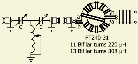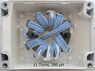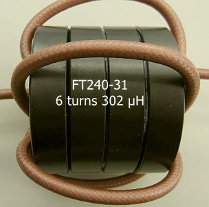 Een FT240-31 is geschikt voor 400 W. Onder gunstige omstandigheden heb ik het met 800 W getest, maar beter is om het op 400 W te houden. Met 13 windingen wordt de zelfinductie 308 µH en met 11 windingen 220 µH.