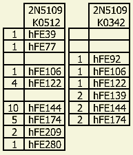 Waarom juist een 2N5109 toegepast? Wel er waren nog originele Motorola's overgebleven van bouwprojecten en experimenten in de vorige eeuw en deze halfgeleiders bleken toen robuust te zijn. Vanwege de vele testen met deze actieve antenne, waren er meer nodig. Het schijnt dat Chinezen rechten hebben verworven om de 2N5109 opnieuw te produceren en daarom werden met enige schroom een tiental in China besteld. Wat blijkt, ze (productie K0512) doen niet voor de originele Motorola's onder. De spreiding in Hfe is ongeveer hetzelfde als de originele exemplaren. In een later stadium werden er nog tien besteld, maar dat bleken nummer K0342 te zijn. In de tabel kunt u de spreiding van beide zien.