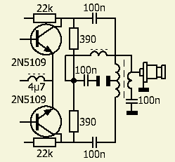 Tijdens experimenteren gebruik ik meestal uitgesoldeerde componenten. Als een ontwerp naar tevredenheid werkt, wordt het netjes opnieuw gemaakt met nieuwe exemplaren. Bij het schema (versie 10-dec-2022) is alles op zoveel mogelijke gelijkheid geselecteerd. Domweg omdat de meetspullen ervoor aanwezig zijn. Zo ook de beide 2N5109's.