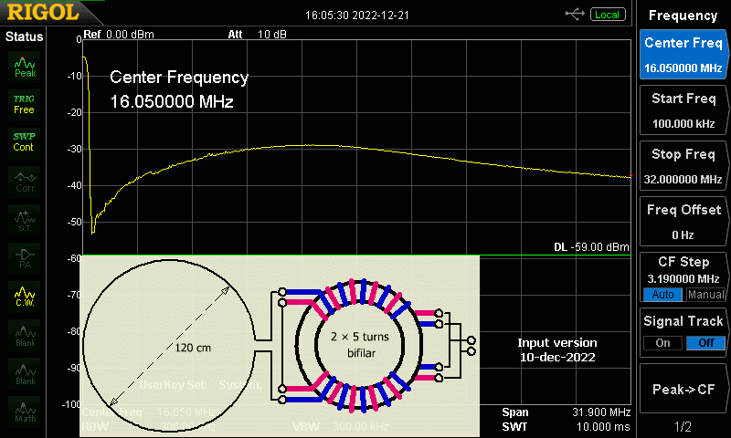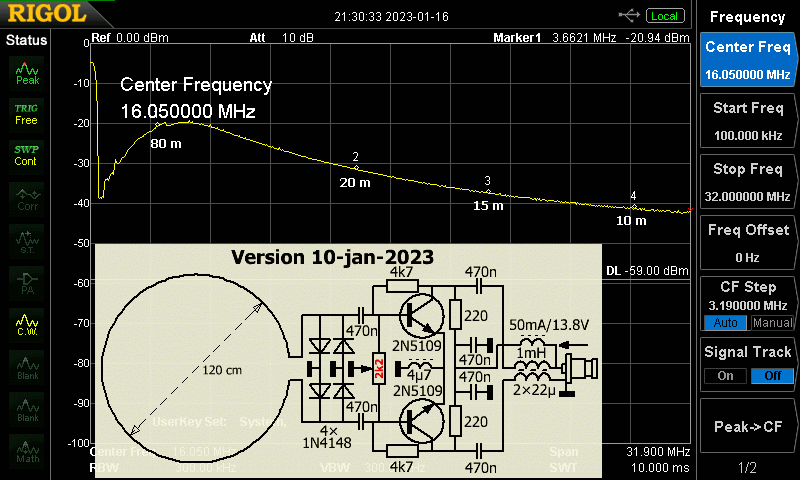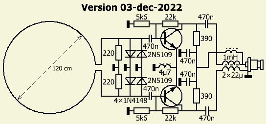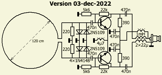 De loop met versterker had een dip tussen 2.5 - 3.5 MHz. Met een koppelcondensator van 1µF naar de basis, wordt het niveau een beetje opgetild. Het blijkt dat de twee weerstanden van 220 Ohm over de loop de ontvangst verbeteren en de versterking gelijkmatiger wordt. Misschien komt dat ook doordat de twee weerstanden een betere symmetrie afdwingen. De verbetering is opvallend.