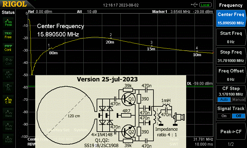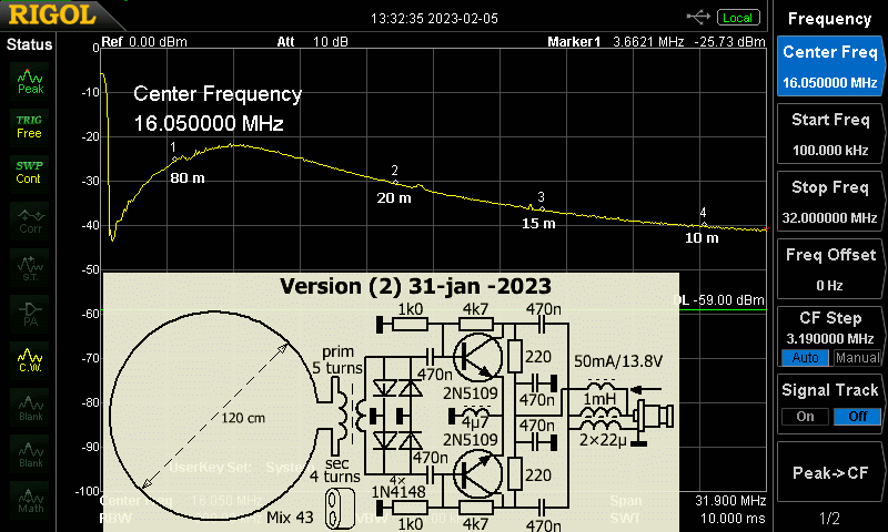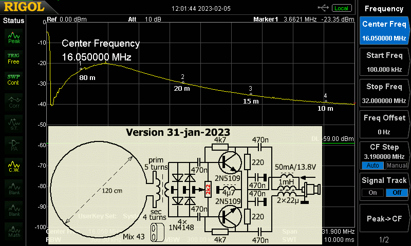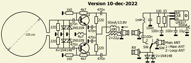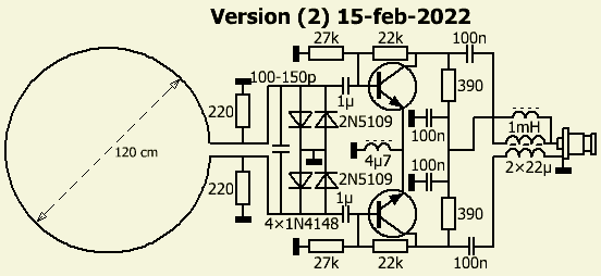 De eerder getoonde versie (2) 15-feb-2022 voldoet op zich goed, maar in het lopende jaar werd toch weer uitgebreid geëxperimenteerd en het blijkt dat het beste resultaat behaald werd met versie 31-jan-2023. Let er op dat de waarden van weerstanden en condensators veranderd zijn. De collectorstroom per transistor is ingesteld op 25 mA zodat het systeem minder last heeft van oversturing.