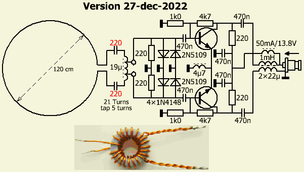 Als men voor de basis instelling een diode gebruikt wordt de schakeling nog eenvoudiger, maar de collector weerstand moet dan 820 Ohm worden. Daardoor vergroot de tegenkoppeling en gaat de ingang impedantie omlaag en de versterking daalt. Met een 4 : 1 trafo aan de ingang wordt de aanpassing beter en verkrijgt men een vlakker verloop van de garfiek. De algehele versterking is veel minder dan het ontwerp van 10-dec-2022.