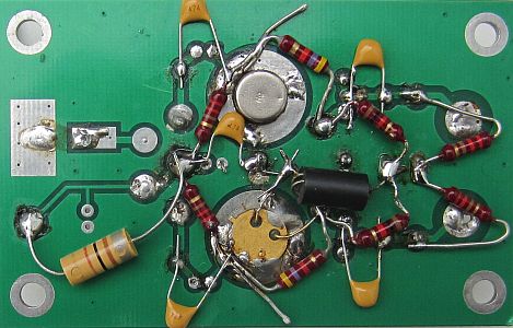 De afgebouwde print werd getest, wat bleek, één 5109 was defect? Eruit gehaald en opnieuwde versterking gemeten, was "goed", terug geplaatst, deed het niet! Met een andere geteste 2N5109 werkte de schakeling wel. Kennelijk ging het niet goed met de "defecte" transistor toen er spanning op gezet werd. Het is dus verstandig om rekening te houden met deze ervaring.