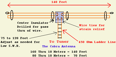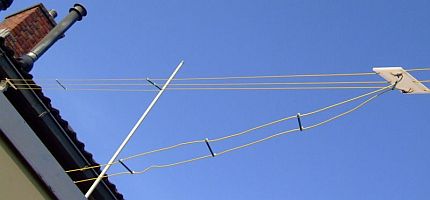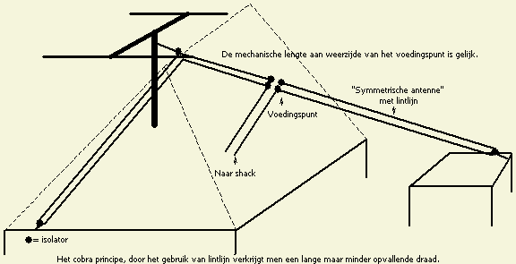 De voordelen van dit symmetrische systeem zijn: - Eenvoudig zelf te maken. - Goedkoop. - Geschikt voor alle banden. - Minimale verliezen. - Veroorzaakt minder storing op radio en TV. - Is zelf minder gevoelig voor storingen uit de omgeving. - Minimale windbelasting. - Niet zo opvallend in een woonwijk. |