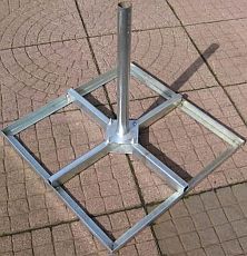 Voor het verankeren van een parasol in een tuin wordt de afgebeelde kant en klare metalen constructie aangeboden en dat lijkt mij met verzwaard met veel tegels ook geschikt voor onze doeleinden. Een antenne fabrikant in Brielle heeft ook zoiets in zijn assortiment.