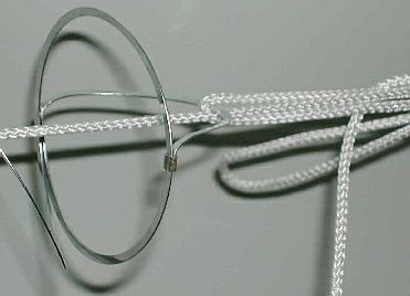 De draad van de antenne door de lintlijn rijgen om de "linear loading" stub op te hangen, zodat geen kabelbinders nodig zijn.