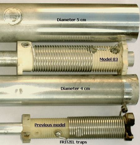 Voor een latere («fig) uitvoering van de Fritzel traps met een diameter van 5 cm, heb ik standaard PVC doppen gebruikt en in het centrum een passend gat gemaakt zodat het klemmend over de binnenste buis schuift. Als men eerst op het uiteinde van de kunststof spoelvorm siliconenvet aanbrengt en dan de dop erop schuift, weet u zeker dat het samenstel druipwater dicht blijft. Door weersinvloeden is de grijze kleur van de doppen bijna wit geworden.