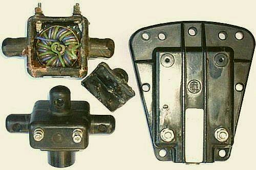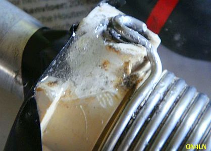 Na 1982 is ook het formaat van de baluns veranderd. Linksboven ziet u wat er gebeurt als het oude model balun overbelast wordt met teveel vermogen of als een FD3/FD4 langdurig gebruikt wordt op 80/160 m. Afgezien van de permanente schade die dat veroorzaakt aan het kernmateriaal is door de hete ringkern het omhulsel gedeeltelijk gesmolten en van vorm veranderd. Op de foto lijkt het mee te vallen omdat met hete lucht de vorm enigszins hersteld is en de scheuren dichtgelijmd zijn. De windingen met teflon isolatie zijn intact gebleven.