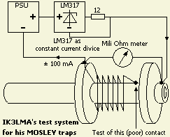 Ondanks een NL tekst heeft IK3LMA kennelijk begrepen waarom het gaat, want hij schreef mij dat het probleem ook voorkomt bij de traps van zijn twee MOSLEY beams. Zij lijken veel op de types van FRITZEL. In tegenstelling tot het contact van spoel met koker, is de verbinding met de antennestaaf visueel niet goed te goed te controleren. Om dat nauwkeurig te kunnen meten gebruikt hij een digitale m? meter in combinatie met een ongeveer 100 mA constante stroombron met een LM317. Daardoor is de meteraanwijzing vrijwel correct in m? af te lezen. Hij schrok van het resultaat en adviseert daarom ook om het een en ander echt te meten en u niet te beperken tot een visuele controle.