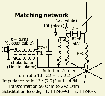 De witte draad gaat 12 keer door de kern en de zwarte draad 9 keer. De ingang (50 Ohm) aftakking is op 9 windingen van een spoel met 21 windingen. De transformatie verhouding wordt dan 1 ÷ 5.444. De 50 Ohm wordt dus getransformeerd naar 50 × 5.444 = 272 Ohm. Niet zo ver naast de 300 Ohm impedantie van een Windom antenne! Het is een asymmetrische voeding of OCF (off center feed) dat veel lijkt op het systeem dat in de FD3 en FD4 antennes van Fritzel toegepast werd.
