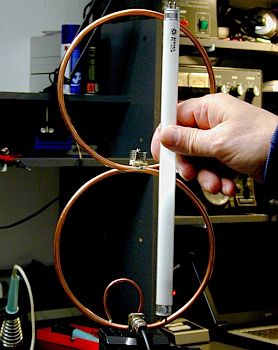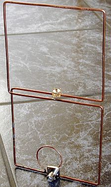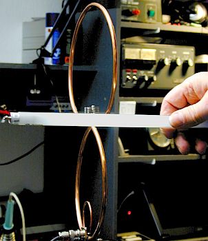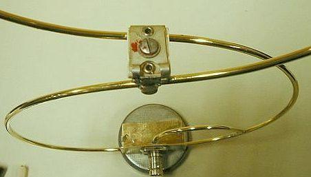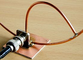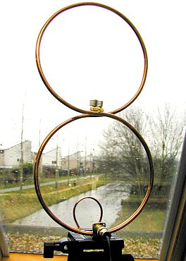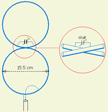 The double-loop (15.5 cm diameter) was shaped from a 1 m length of 3 mm diameter brass welding rod. Using thicker copper tubing may increase the efficiency. A can with an approximate diameter of 12 cm makes a good bending jig. The loop was closed at the crossover by soldering the rod ends into a 2 cm long tube with an inner diameter of 3 mm.