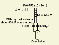 An experiment showed that the test antenna gave best result with two 400 pF capacitors. Actually it was 424 pF, but a suitable RF capacitor was here not (yet) in stock. For now, the length of the dipole is 2 × 14.80 m and the 450 ohm ribbon line is 12.0 m. It needs further experiments to discover if all values are optimal.