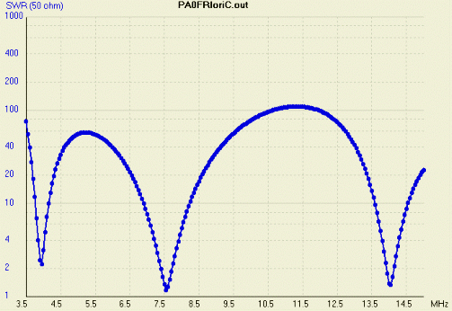 These graphs indeed shows that 400 pF is not the correct value to improve the SWR within our 80 m band. The resonance point can be shifted by changing 4 MHz to 3650 MHz for example. Incidentally, it is better to feed the antenna system with a symmetrical antenna tuner.