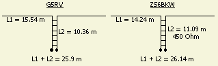 ZS6BKW has its antenna modeled with a program starting from the known G5RV antenna. You see that L1 + L2 is close to 26 to 27 m. If the antenna system is fed directly or with a coaxial balun, it is to long on 80 and the SWR is not very suitable. It could be improved by capacitances in the feedline. If this is installed between ladderline and coaxcable, the shortening at 80 m is largest and has not much influence on the highest bands. Such shortening capacitor I already have used in a FD4 system.
