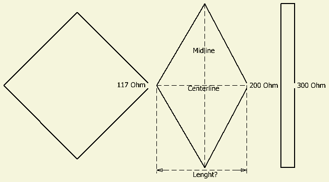 Als het vierkant ingedrukt wordt of de gevouwen dipool uitgerekt is, verkrijgt men een rhombus (NL rombus) figuur waarvan het voedingspunt tussen 117 en 300 Ohm zou moeten liggen.