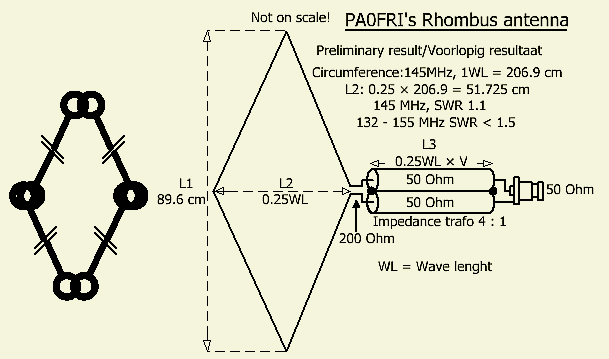 Een breedband antenne met een voedingspunt van 50 Ohm kan waarschijnlijk bereikt worden door vier rhombus antennes parallel te schakelen voor een verticale rondstraler. De constructie is bij 2m aan de grote kant, maar voor 70 cm is het misschien een geschikte antenne voor 70 cm repeaters.