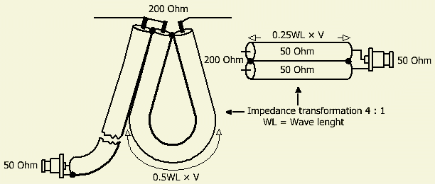 Het aanpassen van 200 Ohm naar 50 Ohm kan met diverse systemen. Redelijk breedbandig gaat dat met specifieke lengtes van coaxkabel.