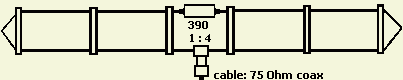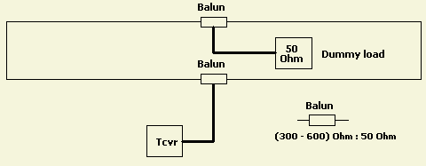 Betaalbare weerstanden van 300 tot 650 Ω voor een behoorlijk vermogen zijn niet meer zo gemakkelijk te vinden. Een meer praktische constructie (fig») verkrijgt men door de weerstand te vervangen door een balun die de hoge impedantie omlaag transformeert naar 50 Ω. Op een geschikte plaats kan dan een dummy load opgesteld worden om via een dunne goedkope 50 Ω coaxkabel het vermogen op te vangen. Een verliesvrije kabel hoeft niet want dempende eigenschappen zijn hier zelfs een bijkomend voordeel!