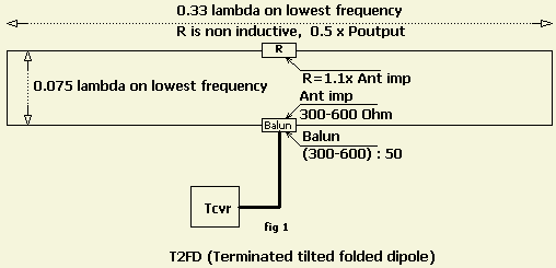 Een T2FD is een niet resonante gevouwen dipool dat afgesloten is met een inductievrije weerstand (dummy load). Er ontstaan lopende golven waarvan een gedeelte wordt geabsorbeerd door de weerstand. Het een en ander resulteert in een breedbandeffect met een redelijk lage SWR om met een coaxkabel te voeden. Alle genoemde eigenschappen waren aantrekkelijk voor militairen en daarom adopteerden zij het systeem ook als zendantenne. Bij hulporganisatie heeft de zendapparatuur een automatische antennetuner zodat de (meestal technisch ondeskundige) operator alleen maar het kanaal hoeft te kiezen en waarna het systeem automatisch op maximum wordt afgeregeld.