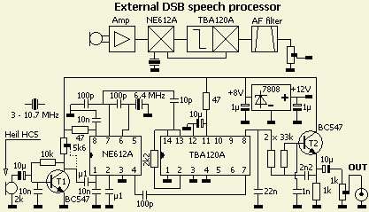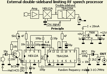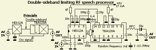 This Double-Sideband RF Speech Processor takes the audio from the microphone and converts it in a NE612A to an internal 6.4 MHz DSB signal. The signal is then clipped in a TBA120A and is further converted back to audio for input to a transmitter or transceiver. The resulting harmonics (of 6.4 MHz) are filtered out with simple RC filtering when it was demodulated back to audio. The result is a 'cleaner' clipped signal being finally transmitted. This increases the average output level of an audio signal from a microphone by clipping off the excessive signal peaks. By lowering the peaks in proportion to the average level, a higher average output level can be attained with an associated increase in intelligibility under difficult conditions. It is set up easily without special equipment because no RF filters are used. It can be used with any make of rig, requiring only signal connections to and from the normal microphone socket. This effective design offers microphone level input and output adjustments. The clip level depends on the amount of microphone gain.