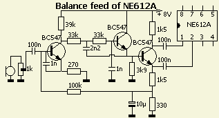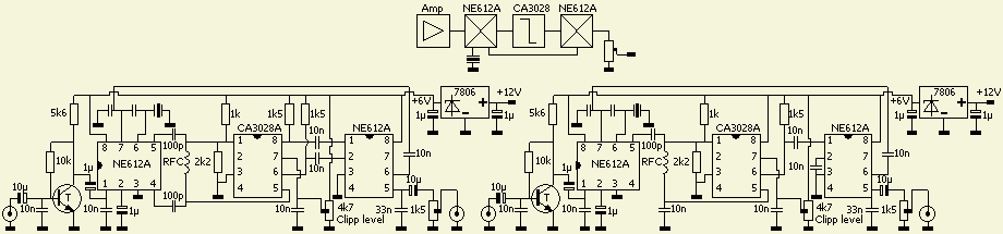 The DSB limiter in my original article (see at the bottom) gave problems for some foreign home brewers. Probably by using a different type of IC (eg TBA120S, TBA120AS, TBA120T, TBA120U) than the previous model (TBA120, TBA120A) which was used in my circuit. Moreover, the older types are difficult to obtain. Reason why I started experimenting with readily available mixer NE612A (or SA12AN). This experimental version («fig) of a speech clipper, one of the many tested designs, worked satisfactorily. See also Atlas speech processor.