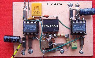 The Murata 6 kHz/6 dB, 18 kHz/50 dB CFW455H filter («fig) is selected as a compromise between bandwidth and price. The type is obsolete, but is still available via internet (ebay.de, ebay.co.uk). More modern versions with the same specifications and with the addition of "H" (eg CFWLA455KHFA-B0) are also suitable. Alternatively, an expensive and narrow SSB filter type CFJ455K13 may used.