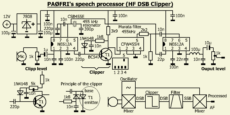 Note that, unlike the designs of others, oscillator and RF signals are respectively routed to pins 1 and 6 of the second NE612A. I did this for more LF output at pin 4. The clipping level is determined by the strength of the microphone signal. Extreme limiting must be avoid to maintain a good understanding. Optimal is a higher average power output while the listener does not notice that a speech processor is in action. The S meter moves much less.