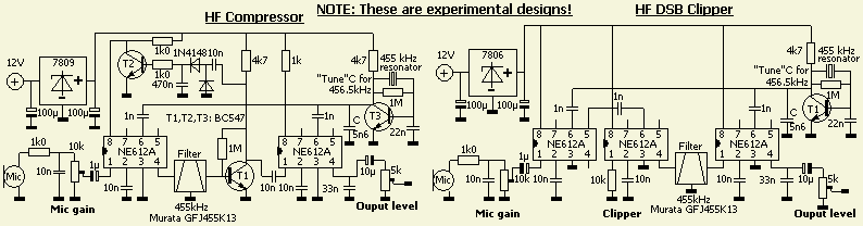 For your information here are a few of my other and possibly interesting designs. At left a compressor where T2 is used as voltage-actuated device and thereby regulates the gain of first NE612A. At right a clipper system with a third NE612A as limiter. Both systems work, but because the previous simple version performs, these circuits are not (yet) "polished".
