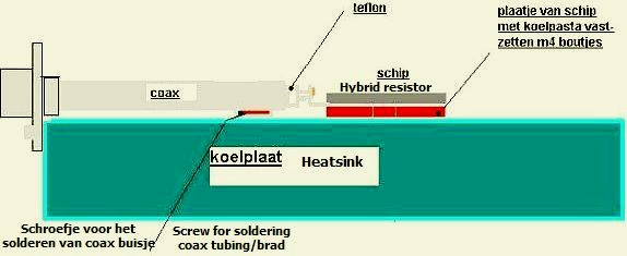 In contrast to the drawing made by PA0KBT the hybrid resistor was mounted in a way that minimised the length of the earth connection between coax and the mounting tab of the resistor.