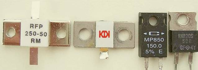 Regularly 150 Watt and 250 Watt 50 Ω resistors are offered on hamfests and eBay. Normally these are a ceramic disc attached to a silvered copper-mounting strip. If the resistor has one tab then this mounting strip is the other leg of the resistor. This makes it possible to make all connections coaxial and very short, thereby reducing the inductance and capacitance. The thin gold plated tab needs to be connected in such a way that it will allow for expansion when the resistor heats up.