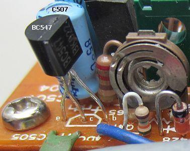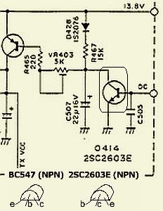 Na ongeveer 3 - 5 minuten schakelde het relais RL301 spontaan over op zenden. Dat wordt in eerste aanleg aangestuurd door Q414. Het heeft enige tijd geduurd voordat de fout gevonden was. Het bleek de lekkende transistor Q414 (2SC2603E) te zijn. Eigenlijk waren deze transistor en elco C507 verdacht. Het merkwaardige is dat de uitgesoldeerde transistor in orde leek te zijn bij een meting met een goedkope Chinese LCR-T5 componenten tester. Kennelijk begon het lekken in de originele schakeling pas na het opwarmen door de 8.0 V voedingsspanning terwijl de tester werkte met een spanning van 3.91 V en daarmee had de transistor een hFE = 279. Dat was een misleidend goed resultaat! Nu de boosdoener eindelijk gevonden was, werd een BC547 gemonteerd en voor de zekerheid ook condensator C507 vervangen. Let op dat de BC547 een andere aansluiting heeft dan de originele transistor.