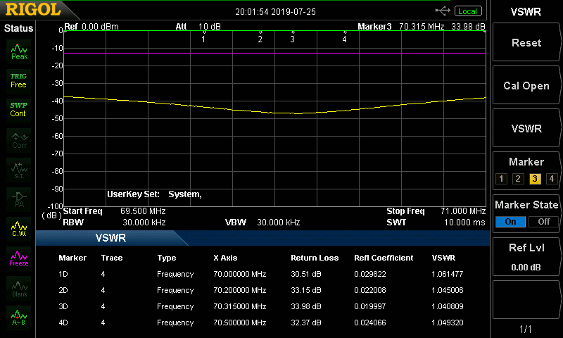 If the filter is mounted in a metal box and its size is (in my case) on the small side, then the chosen frequency shifts up. Outside the box I have to set about 500 kHz lower to reach the desired frequency within the 70 MHz band when it was mounted in the box.
