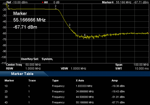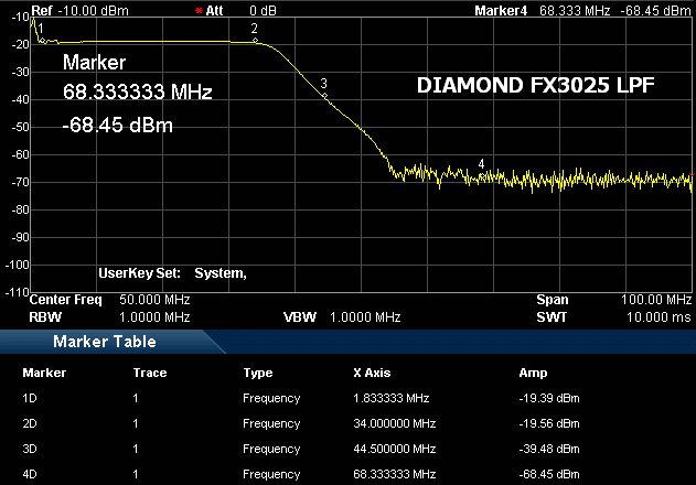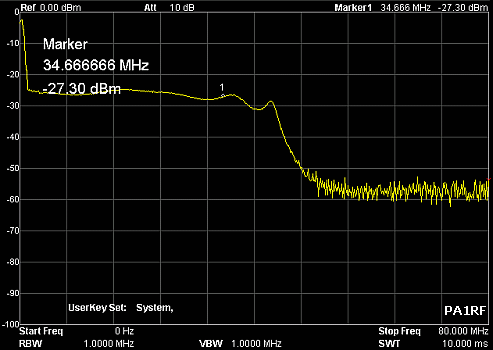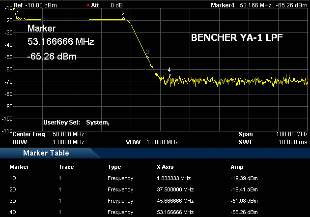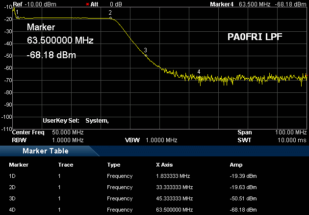 Met een spectrum analysator kunt u vaststellen dat dit ontwerp een betere en steilere curve heeft dan veel andere LPF's («fig LPF30). Al vrij direct na 29.7 MHz begint het onderdrukken van hogere frequenties. Een optimale werking is er als in en uitgang afgesloten worden met 50 Ohm. Er zijn hier drie typen gemaakt voor respectievelijk QRP, 200 W en minstens 1000 W.
